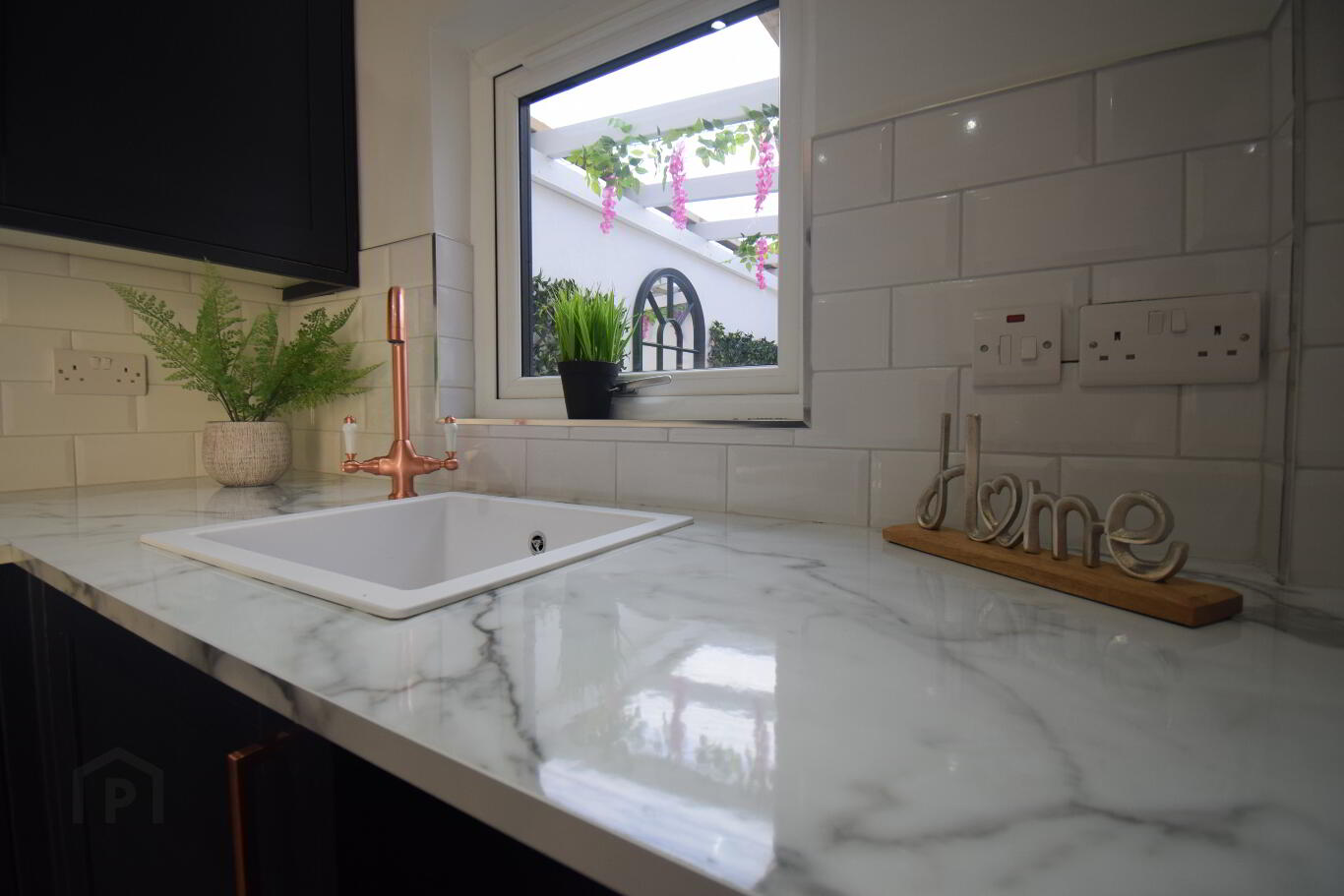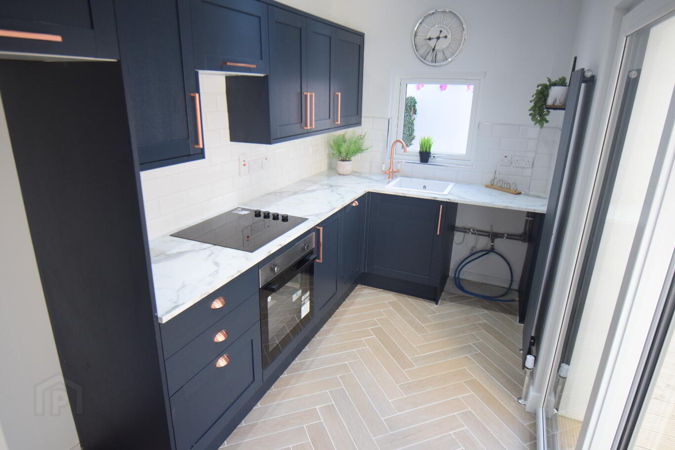 Kitchen 2.02m x 3.5m (6' 8" x 11' 6")Newly fitted luxury royal blue kitchen with copper hardware, laid in herringbone ceramic floor tiling, metro brick wall tiling, an integrated oven/hob/hood with space for washing machine and fridge freezer, with recessed ceiling lighting with feature patio doors that seamlessly lead to decking area.