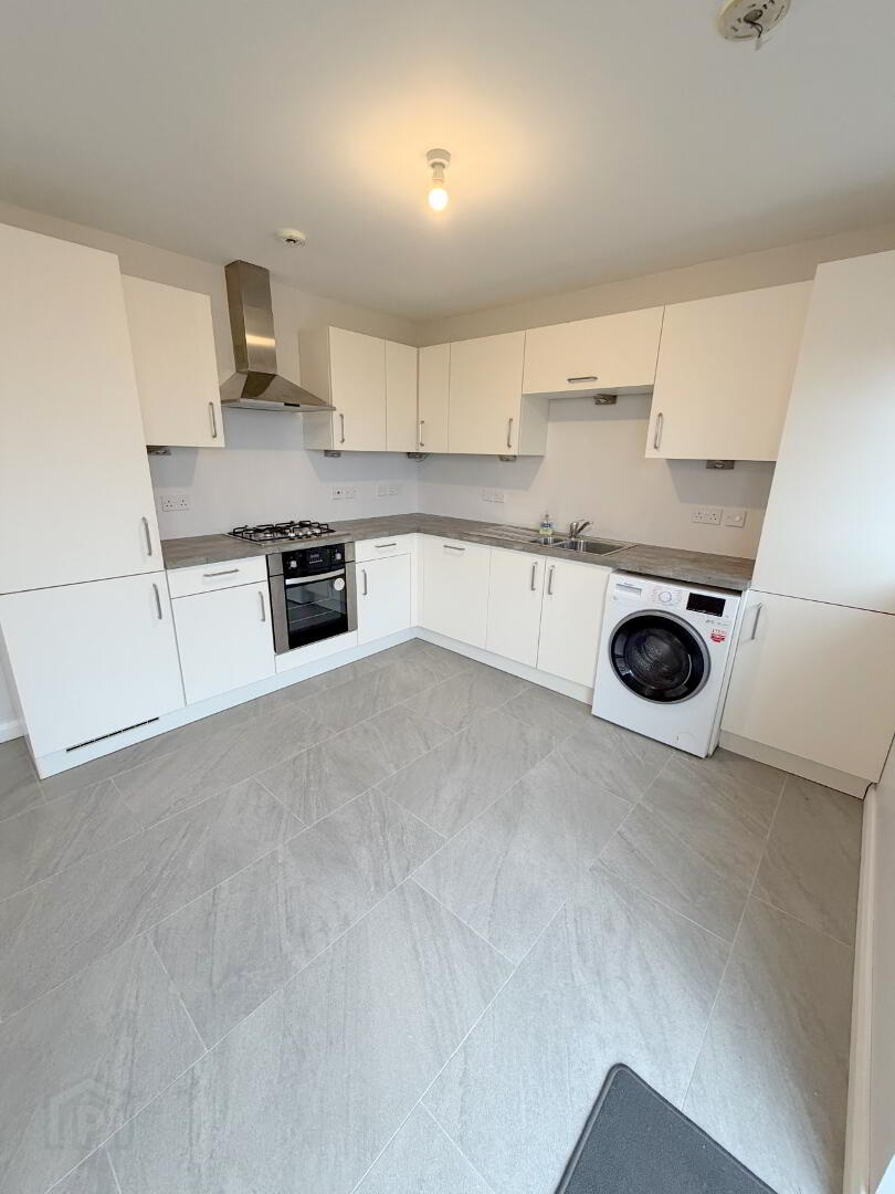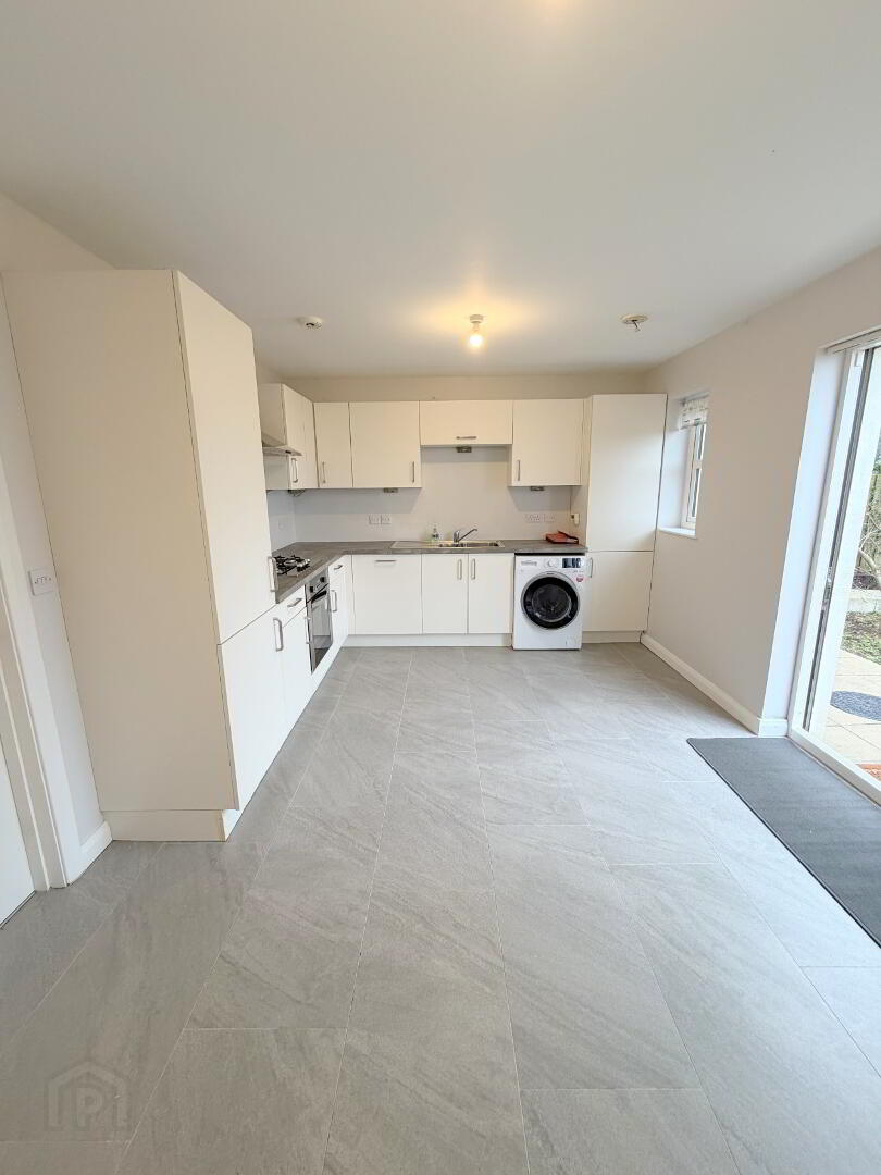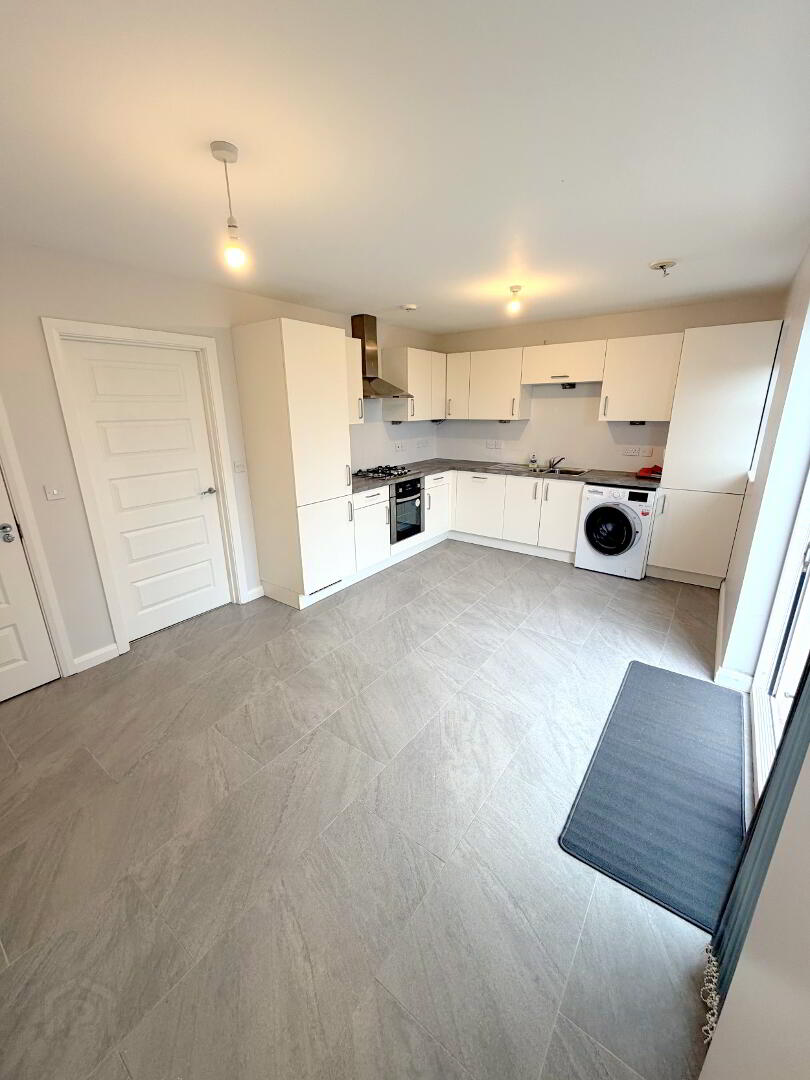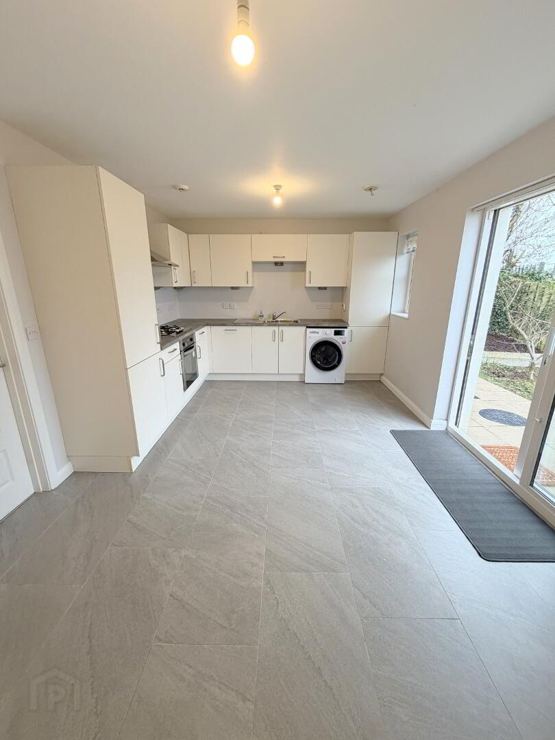 Modern white kitchen/dining room, with an array of high- and low-level units, oven, hob and hood, washing machine, fridge freezer and boiler housing, laid in stone effect porcelain tiling. Sliding patio doors, allowing in an abundance of natural light.
