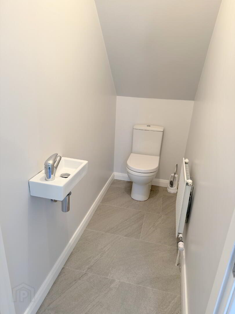 Downstairs WC, laid in stone effect porcelain tiling, with low flush WC and wall mounted sink.