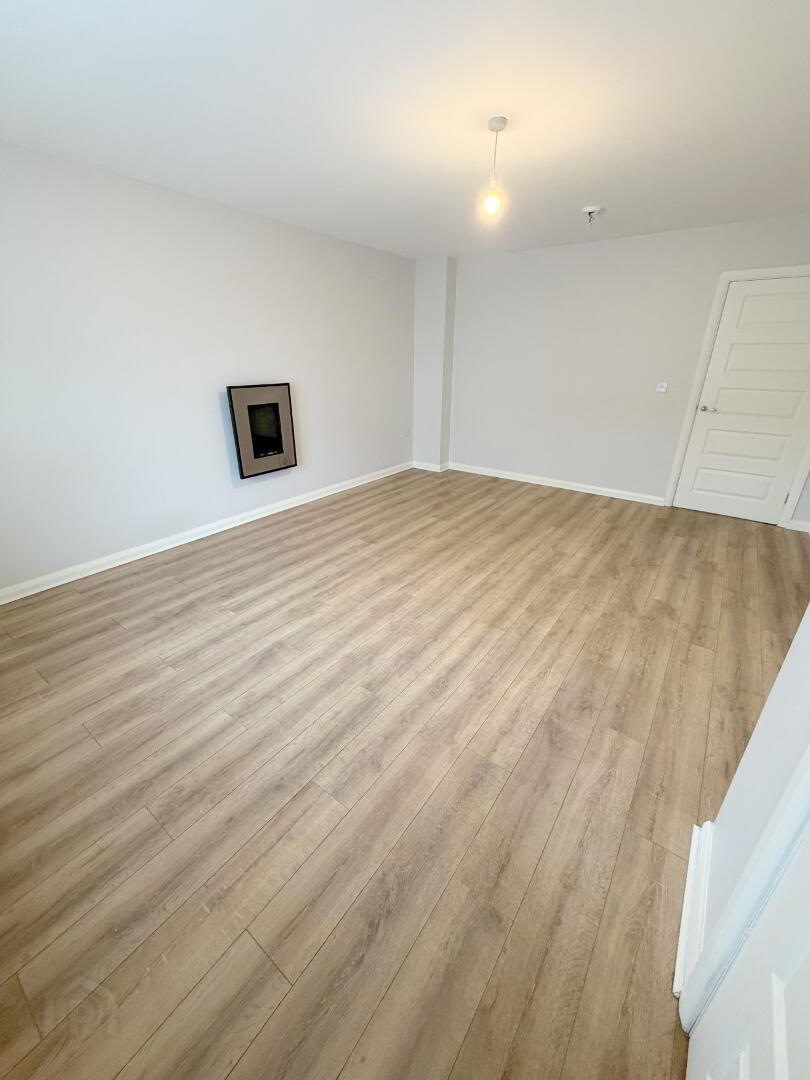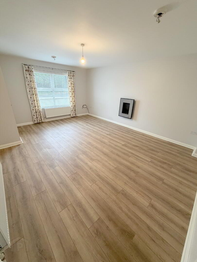 Spacious bright living area, laid in wooden flooring, with feature electric wall mounted fireplace.