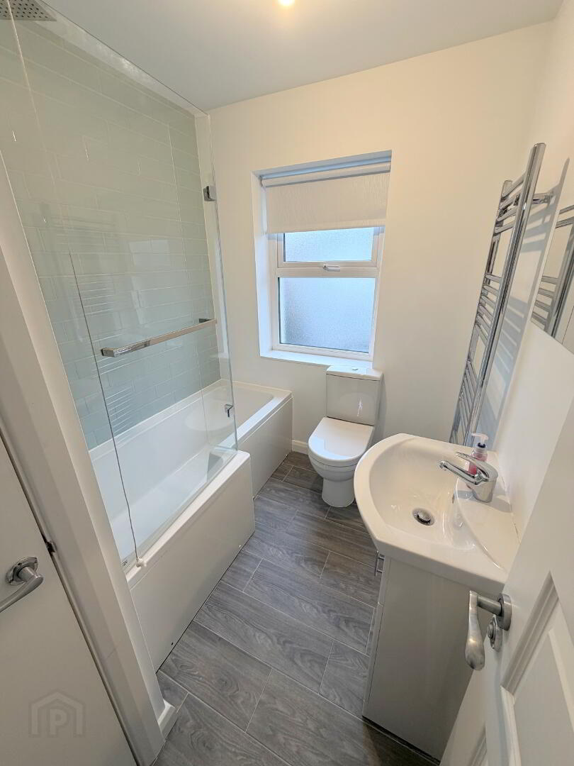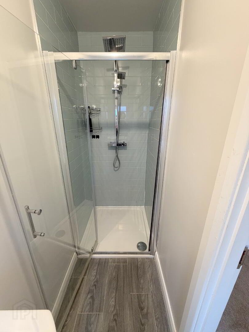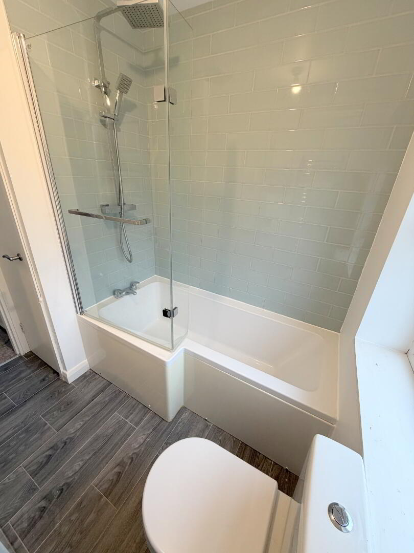 Three-piece bathroom suite, consisting of shower over ‘P’ shaped bath, sink and vanity unit and low flush WC. With heated chrome towel rail and built in storage.