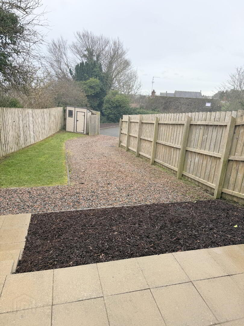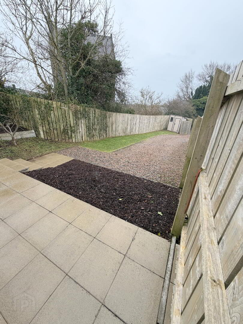 Large, gated private rear garden, with raised paving area, flower beds, lawn space and stoned area.