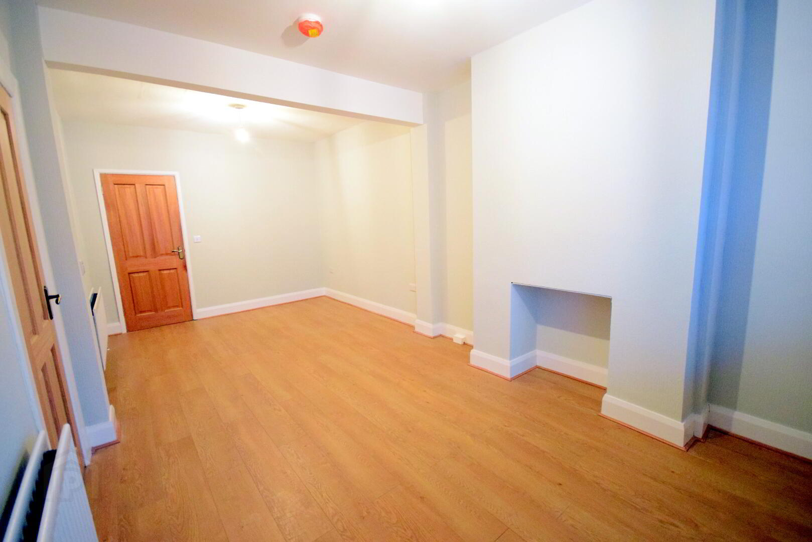 • Spacious open plan living / dining area, laid in laminate wood effect flooring, with feature fire opening.