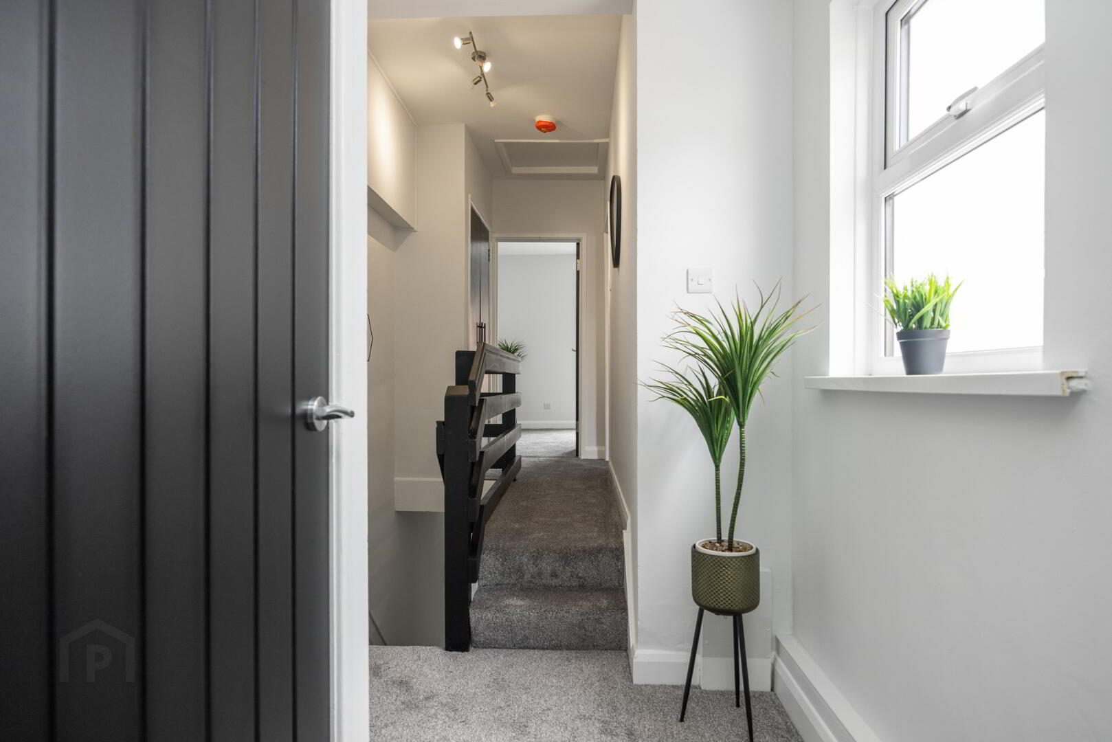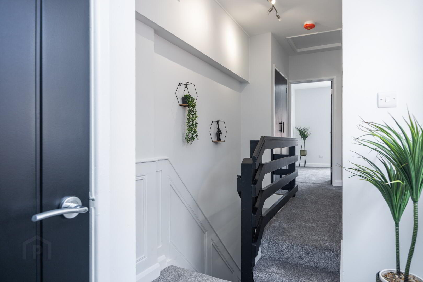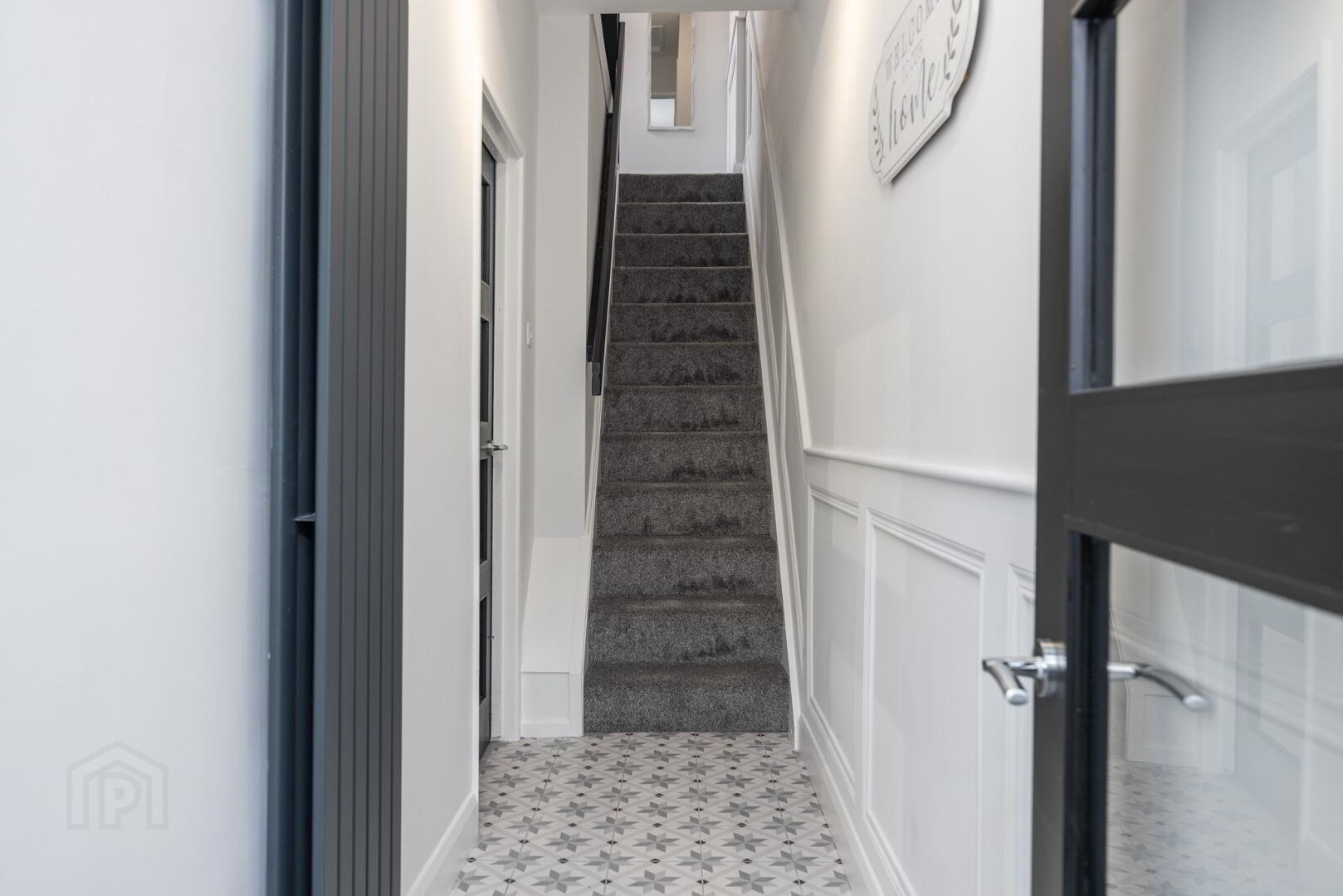 Stairs and Landing, laid in plush grey carpet with underlay, with feature wall panelling, leading to;