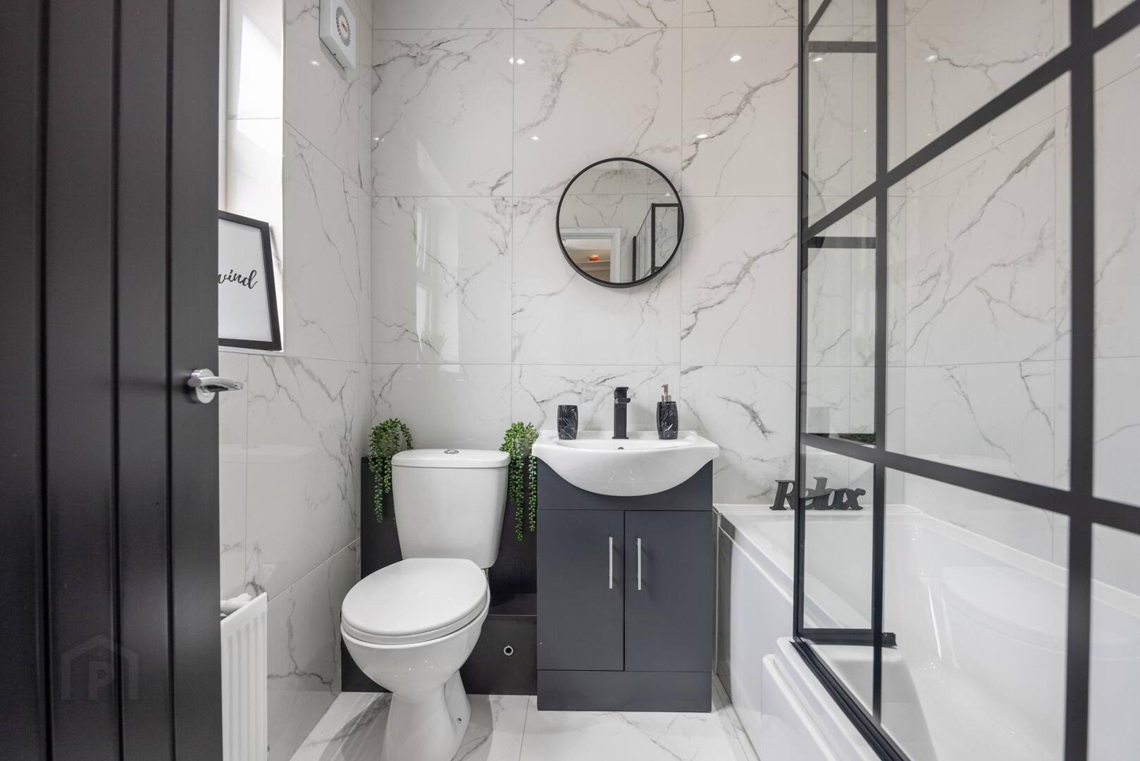 Luxurious three-piece bathroom suite, finished with sleek white marble effect ceramic tiling across both walls and floors, creating a cohesive and luxurious feel. Featuring shower over ‘P’ shaped bath, low flush WC, and a sink and vanity unit for practical storage. Contemporary black fittings, including a black towel rail, adding a modern contrast to the elegant tiling