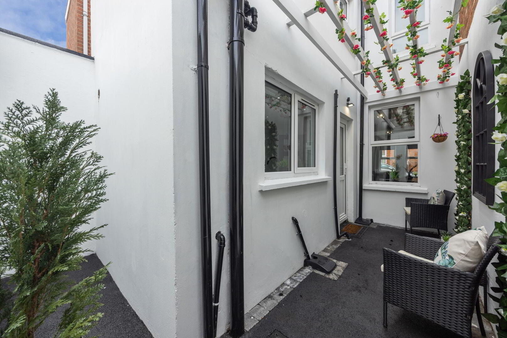 Outdoor area, laid in bitmac tarmac, with paver edge.