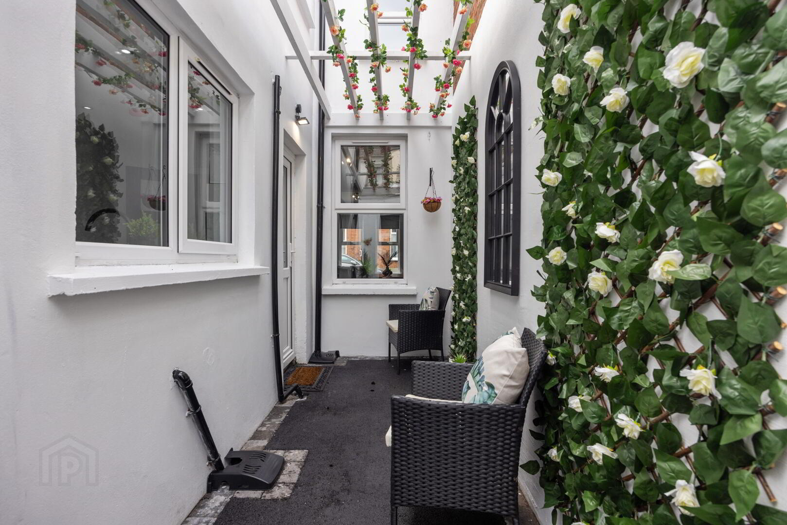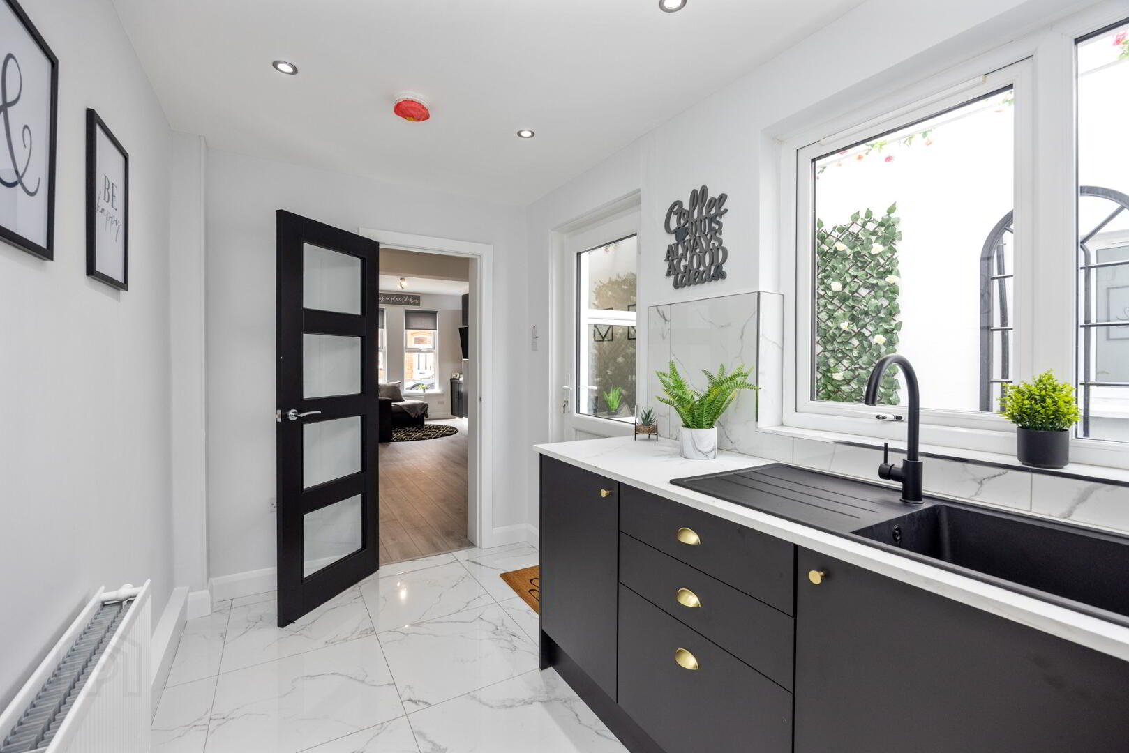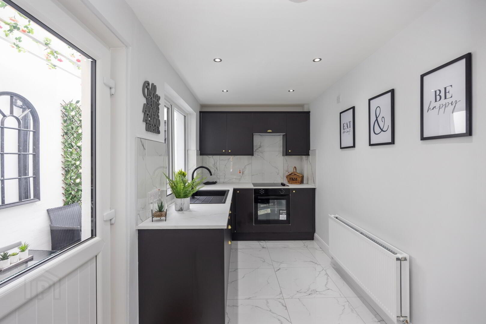 Partially glazed door, leading to well-proportioned kitchen area, thoughtfully designed to offer modern, comfortable living with a luxurious touch. At its heart is a newly fitted charcoal kitchen, complete with sleek high- and low-level cabinets, elegant brass hardware, marble effect worktops. The design includes a matching boiler housing cupboard and integrated appliances, including an oven, hob and extractor for a streamlined finish. Ceramic marble effect floors run throughout the space. Back door, open directly onto the rear yard, creating a seamless connection between indoor and outdoor living.