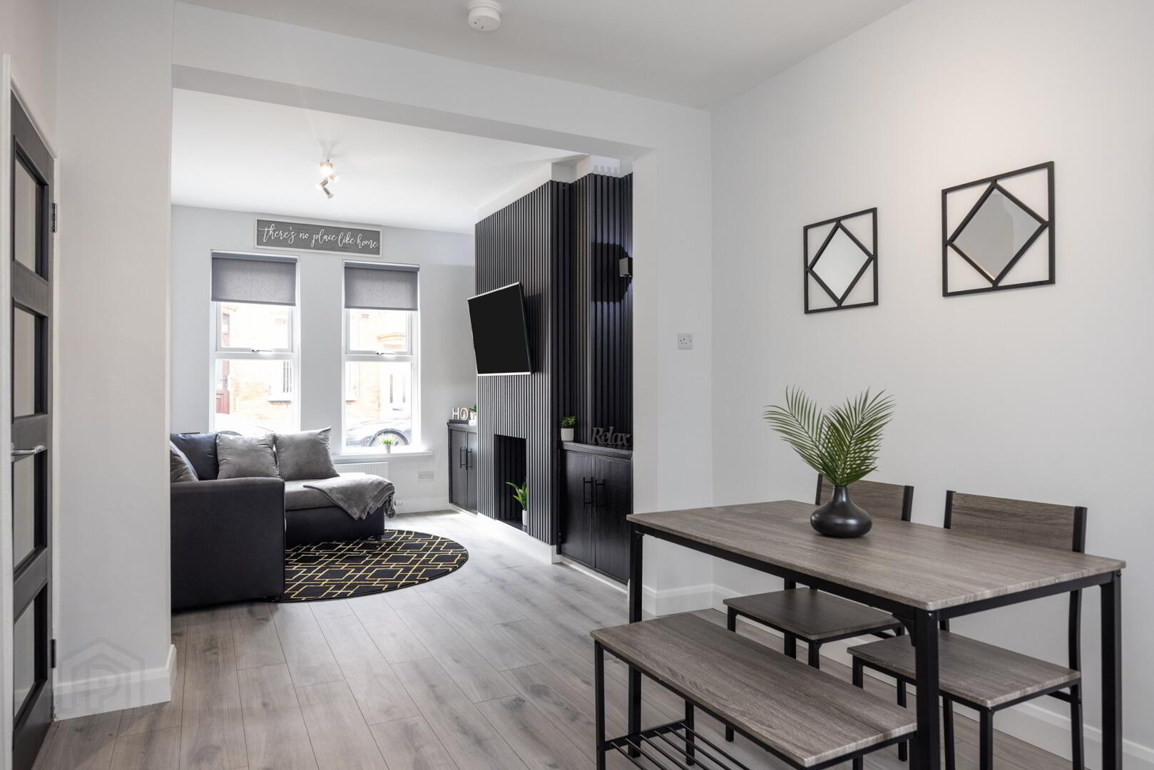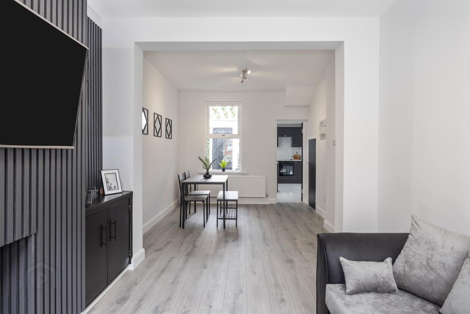 Partially glazed door leading to, open plan living/dining area, laid in grey laminate wooden flooring. Living area with feature ‘Media Wall’, with built in storage cupboards and up down lighting. Dining area with additional, understairs storage, perfectly designed for modern living and entertaining, this bright and inviting room effortlessly blends contemporary design with timeless features.