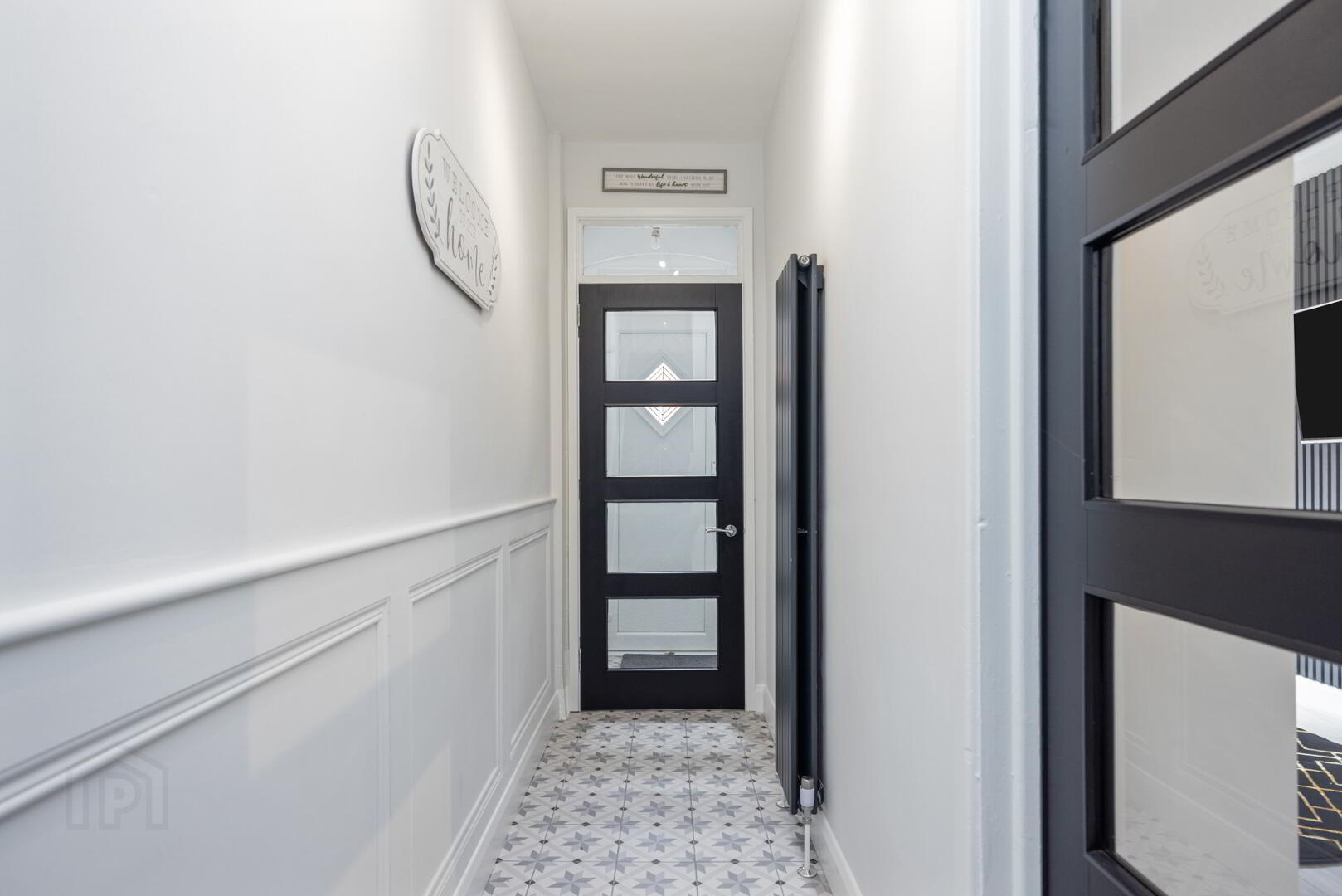 Entrance Hallway, laid in ceramic ‘London Mosaic’ style flooring, with elegant wall panelling and a sleek grey anthracite radiator, leading to;