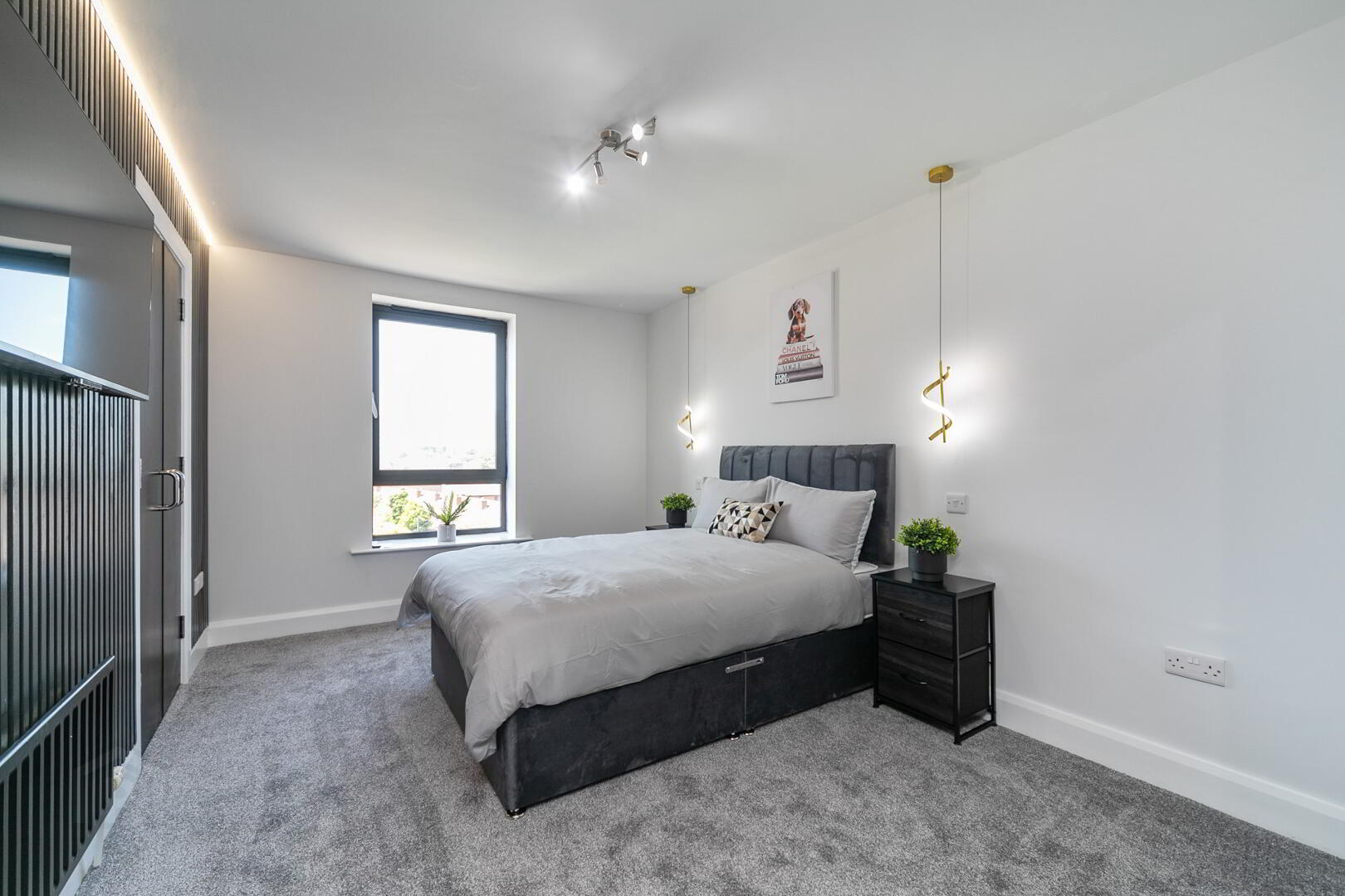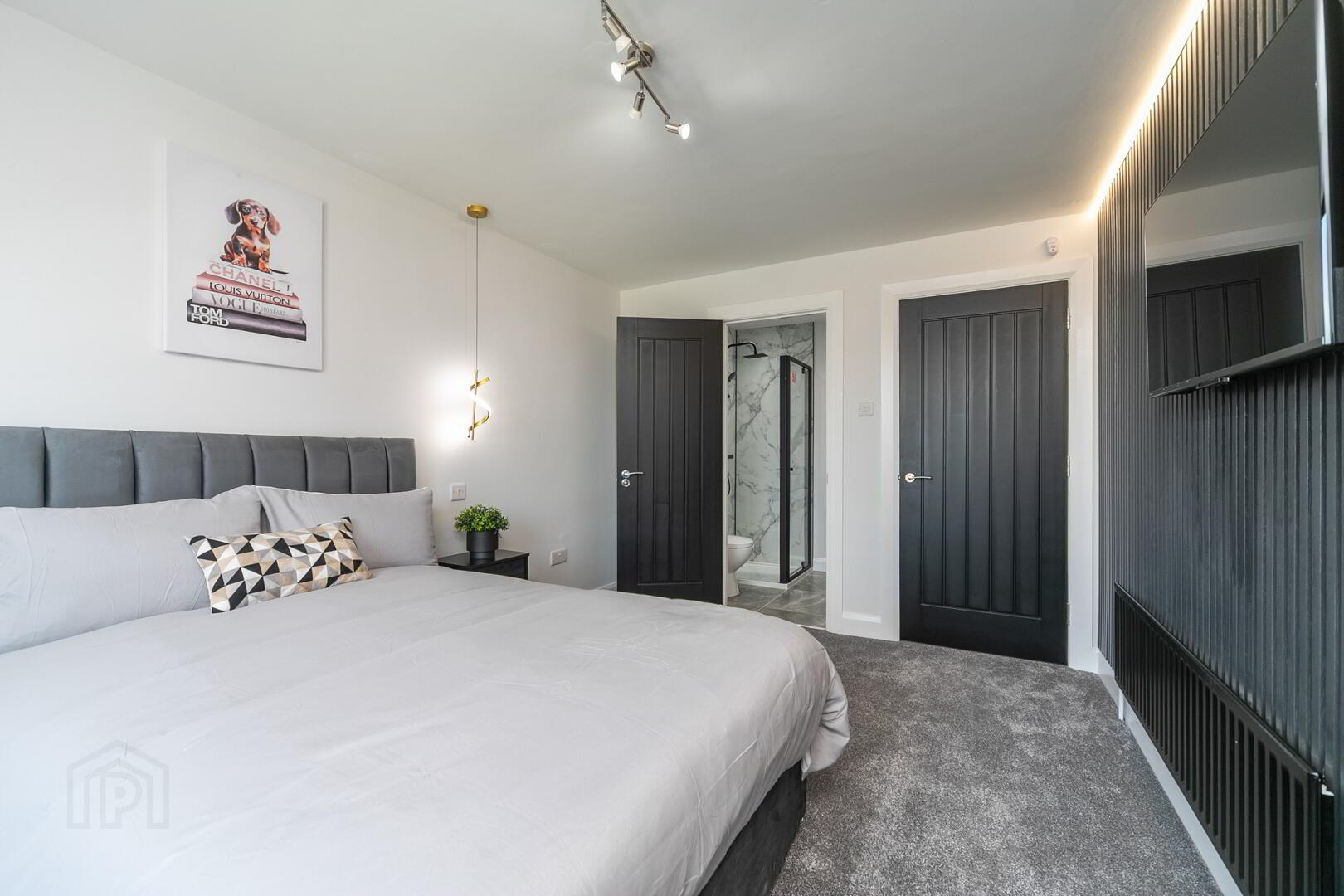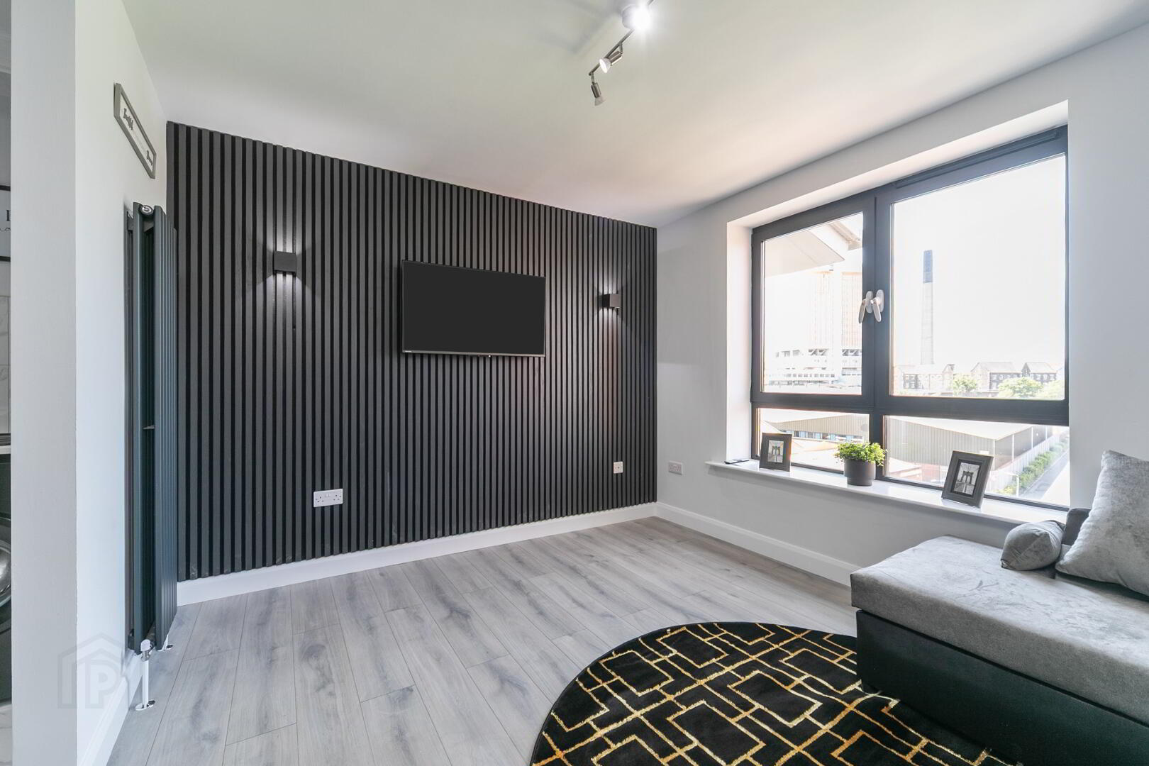• Living area, laid in grey laminate wooden flooring. Feature media wall, with acoustic wall panelling, and up down lighting and a modern vertical anthracite radiatorSpacious master bedroom, laid in a plush grey carpet, with feature acoustic wall panelling, built in wardrobe space, and feature gold hanging lights