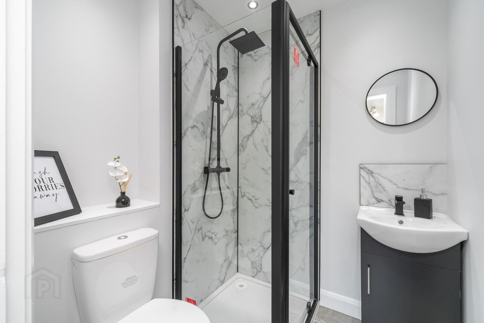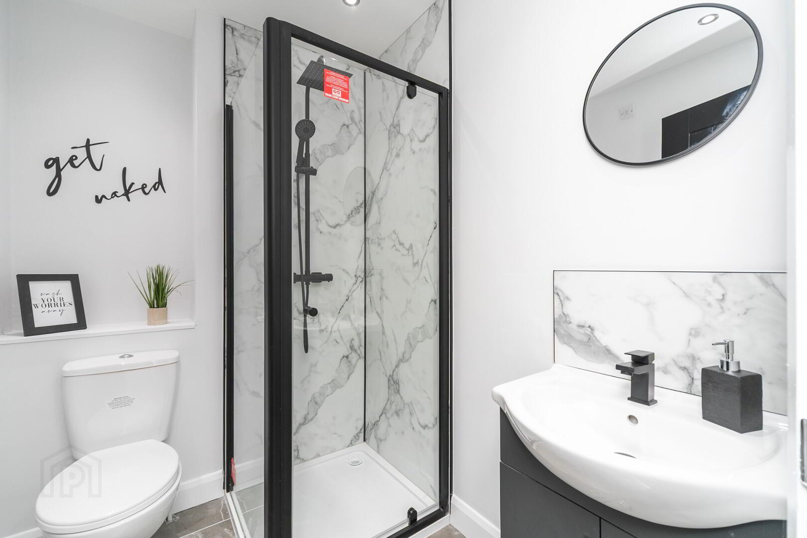 • Laid in grey, ceramic marble effect floor tiling and white marble effect shower splash back.Three-piece ensuite, with shower cubicle, with black shower fittings, low flush WC, sink & vanity unit, with marble effect ceramic tiled splash black and black towel radiator.