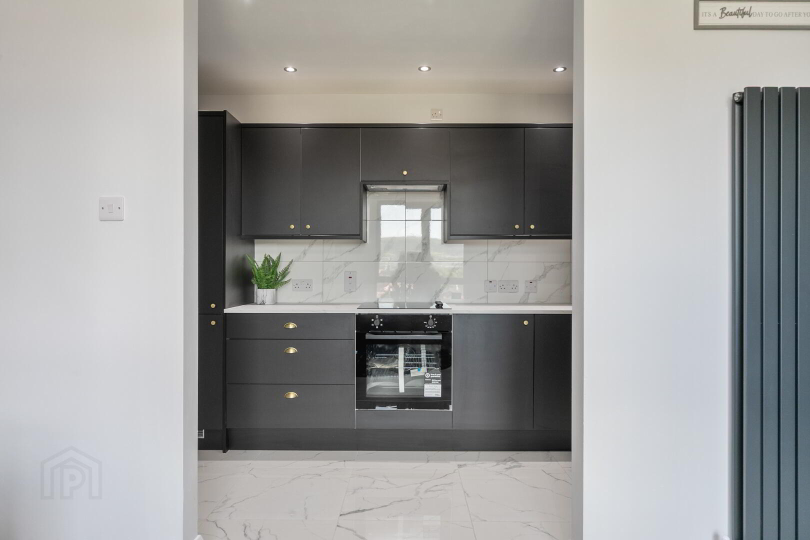 • Open Plan kitchen/living/dining area. Modern, newly fitted charcoal kitchen, with gold hardware, marble effect worktops and ceramic marble effect splashback tiling. Floor laid in ceramic marble effect floor tiling. This kitchen is equipped with an integrated oven/hob/hood, integrated fridge freezer, washing machine and an array of high- and low-level units.