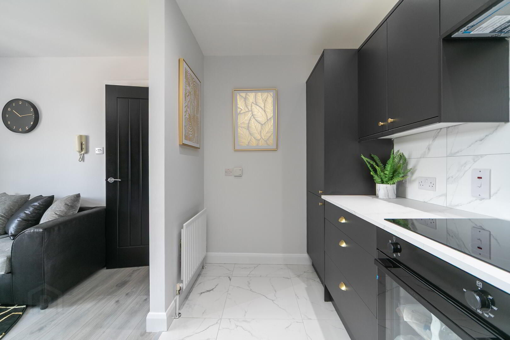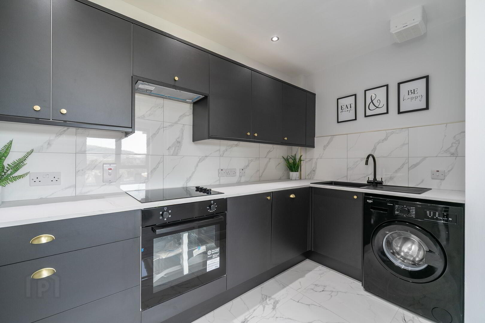 Modern, newly fitted charcoal kitchen, with gold hardware, marble effect worktops and ceramic marble effect splashback tiling. Floor laid in ceramic marble effect floor tiling. This kitchen is equipped with an integrated oven/hob/hood, integrated fridge freezer, washing machine and an array of high- and low-level units